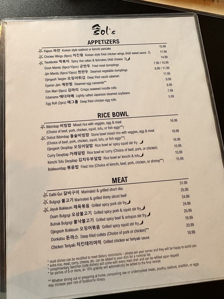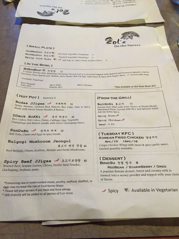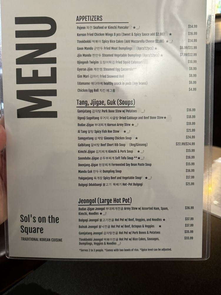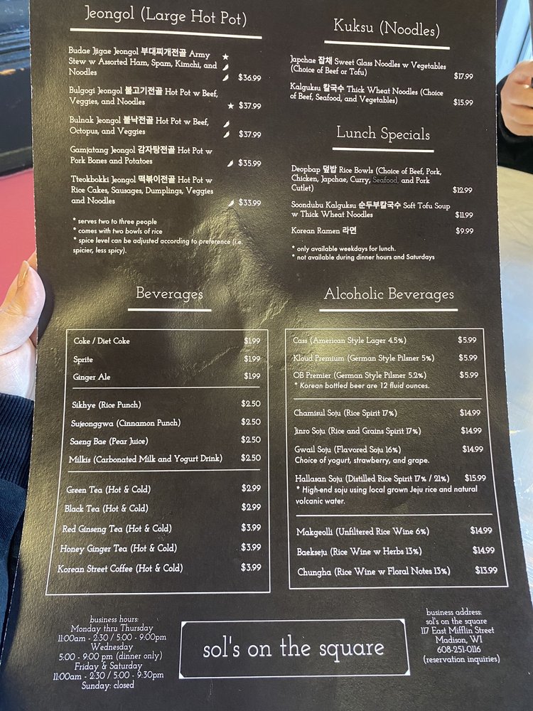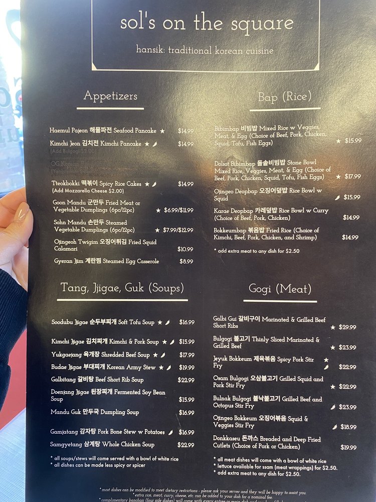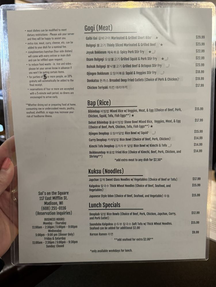 Sol's On the Square is a Korean restaurant in Madison offering a wide range of authentic dishes. From Seafood Pancake to Kimchi Soup, their menu is packed with flavorful options. Customers rave about their Tteokbokki, Bibimbap, and Kun Mandoo. The friendly service and cozy atmosphere make it a go-to spot for Korean food lovers. The Galbi Tang and Osam Bulgogi are highlighted for their rich flavors and generous portions. The restaurant's commitment to quality and customer satisfaction shines through in each dish served. With a variety of appetizers, soups, and special big soups to choose from, Sol's On the Square is a must-visit for those craving traditional Korean cuisine in Madison. Don't miss out on the banchans and be sure to try the Soju for an authentic dining experience.